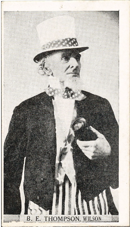 Another curiosity of the set is the Wilson card depicting B. E. Thompson, a non-player dressed in an Uncle Sam costume. Benjamin Thompson was a Civil War veteran, and a prominent Wilson tobacco farmer; his inclusion in the set suggests that he was a local celebrity who sold leaf to Erwin-Nadal.1