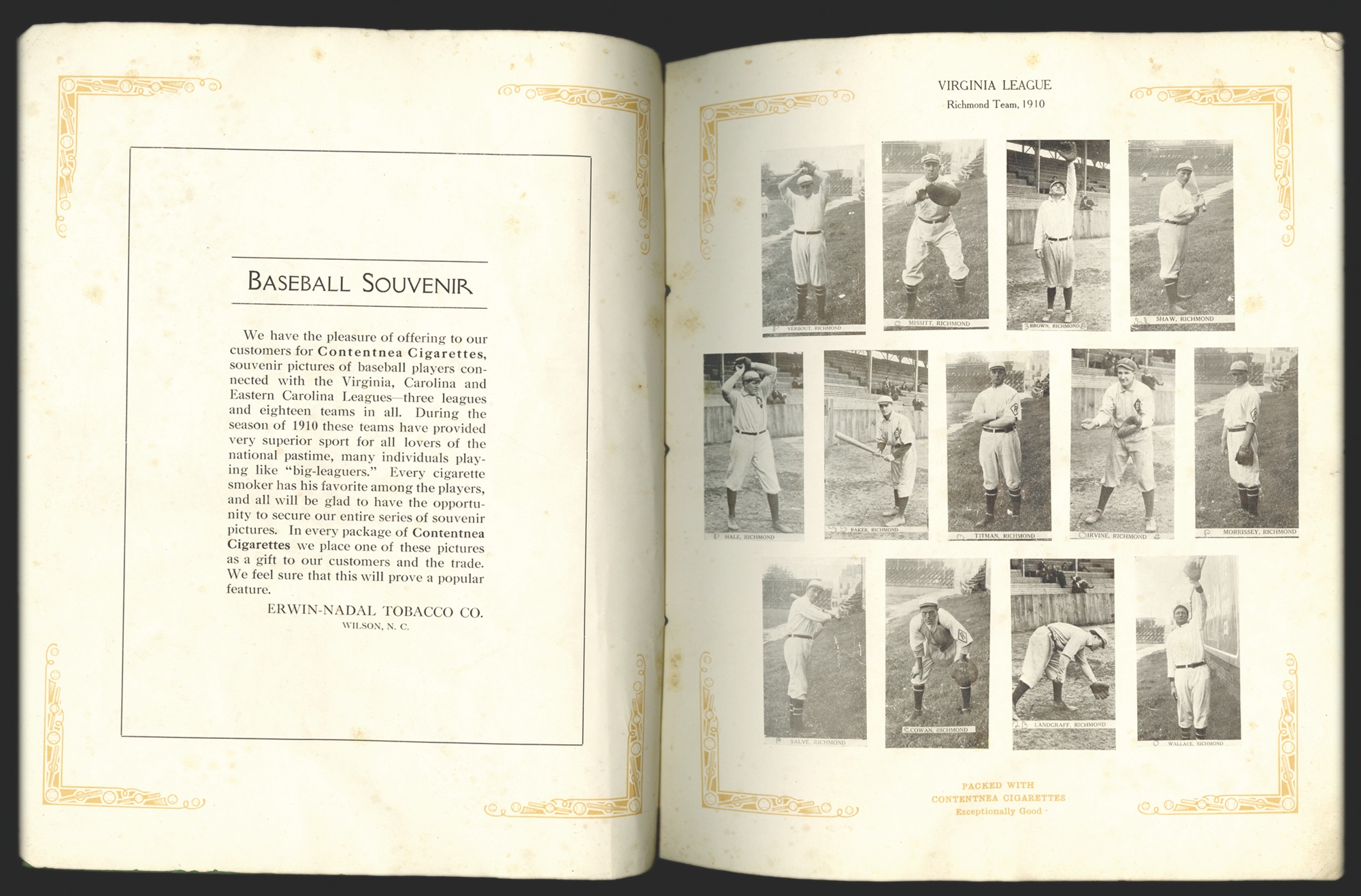 The back of Thompson’s card depicts the Contentnea logo and encourages recipients to take the card to their “dealer,” presumably to redeem it for a premium. Collectors have speculated that the premium may have been a pocket-knife, a lighter, or additional Series Two cards. We believe that the premium was the album pictured below, recently discovered by a long-time collector. Entitled “Baseball Souvenir,” the album depicts all eighteen teams represented in the set, 211 of the player cards, and B. E. Thompson.