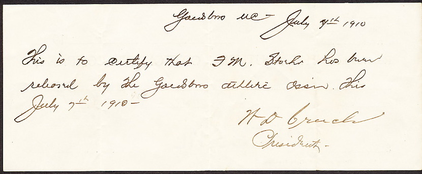 One other interesting bit of information in the letters is Stoehr’s oblique references to his having sent a “card” with a letter he wrote to someone. Could the “card” have been his Contentnea baseball card? He never says more about this card, nor does he mention player photos being taken. One can assume, however, that since his T209 card affiliation is with Goldsboro, his photo was probably taken early in the season and the card printed well before his release in early July.