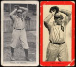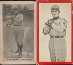 The examples below demonstrate that while the poses are the same, the final image is usually altered in T210 cards. Instead of reproducing original photographs like T209-II, T210 uses lithographic player depictions similar to T206. Another major difference is that T210 versions eliminate background subject matter, like stadiums, that T209 photographs reveal, making T210 images somewhat generic and uninteresting. Because T210 cards were produced lithographically, occasionally team logos were superimposed on a player’s shirt, hat or sleeve to help the viewer identify the player’s affiliation, even though team logos did not exist in the original photograph. That kind of identification seemed unnecessary in T209 since contemporary viewers probably recognized the player on his card.