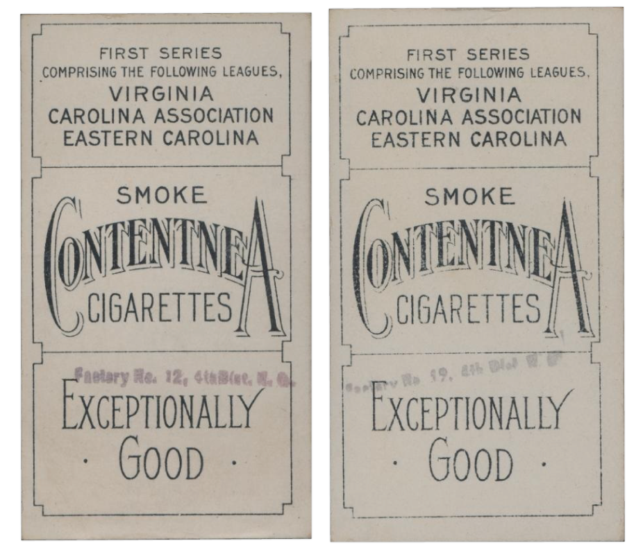 The Contentnea Series One backs identify the cards as being from the “First Series.” Unlike most other card issues of the period, they were not printed with the factory number of the cigarettes packed with the cards, as required by law. This apparent oversight was subsequently corrected by the use of a hand-stamped “Factory No. 12, 4th Dist. N.C.” Such hand-stamped overprints have been found in black (very light impression) and purple. There are unconfirmed reports of green-stamped backs.
