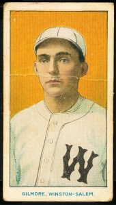 Even with the growing compilation of early minor league rosters and statistics in recent years, at least four cards in Series One are mysterious. Hub Gilmore (at left) is listed with Winston-Salem on his card although he actually played for Wilson. The logo on his shirt is the same as his Wilson teammates and is different from the “WS” logo of Winston-Salem. Dan McGeehan’s card (shown at left) correctly lists him with Wilson, but his collared uniform and the logo are different from the rest of the Wilson team. “Legs” Martin (below), listed with Spartanburg, wears a cap bearing a “W,” not an “S.”