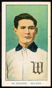 Since Contentneas were produced in Wilson, the teams represented in Series One (Goldsboro, Greensboro, Raleigh, Rocky Mount, Spartanburg, and Winston Salem) function like spokes on a wheel for the regional sales area, with Wilson as the hub. The Wilson team won the 1909 Eastern Carolina League championship, drawing large crowds to its home games. So it makes sense that Wilson has the greatest number of players represented in the set (five), followed by Raleigh (four), and Goldsboro and Greensboro (two each). Four of the sixteen players in the first series, Red Booles, Davey Crockett, Daniel McGeehan, and Joe Walsh played briefly in the major leagues.