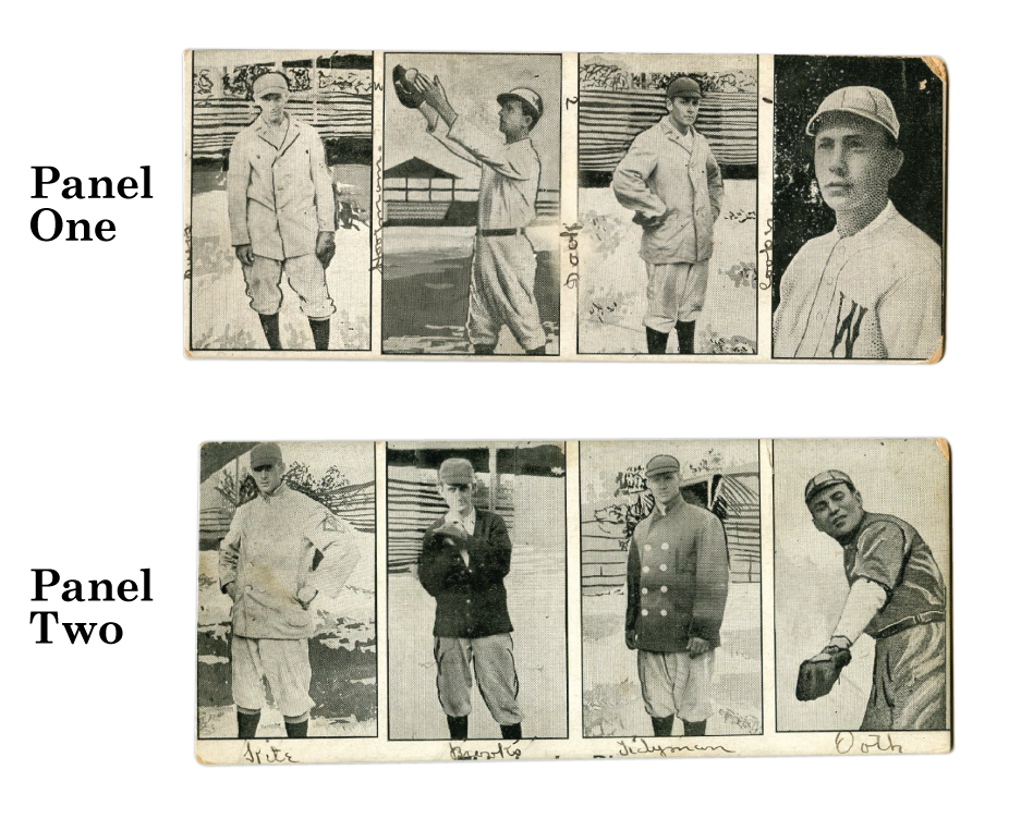 Each panel contains four player photos printed horizontally, with hand-written names identifying each photo. Panel One contains two players (Hoffman and Cooper, players number two and four) who are depicted in the pose found on the Series One card. The other two are Doak (player number three), probably Fred Doak who appears in Series Two (in a different pose), and an unidentified player. Panel Two includes Lynchburg’s Al Orth in his T206 pose (player number four). But because Orth was depicted in ATC’s series, Erwin-Nadal perhaps decided not to invade their turf. Tidyman (player number three) could be either Vincent Tydeman (Wilmington) or John Tiedemann (Norfolk) both of whom are depicted in Series Two (in different poses). Brooks (player number two) could be pitcher Harvey Brooks (Wilmington/Lynchburg), not depicted in Series Two, while the other photo is of an unknown player.